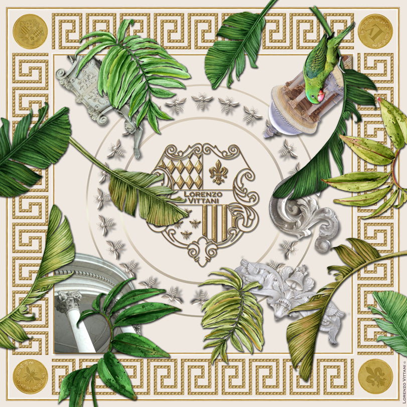 A stunning combination of Greek key pattern and ornate stonework on a plain almond coloured background.