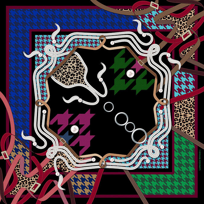 A multi coloured houndstooth deisgn with a touch of leopard print, and lots of straps for interest.