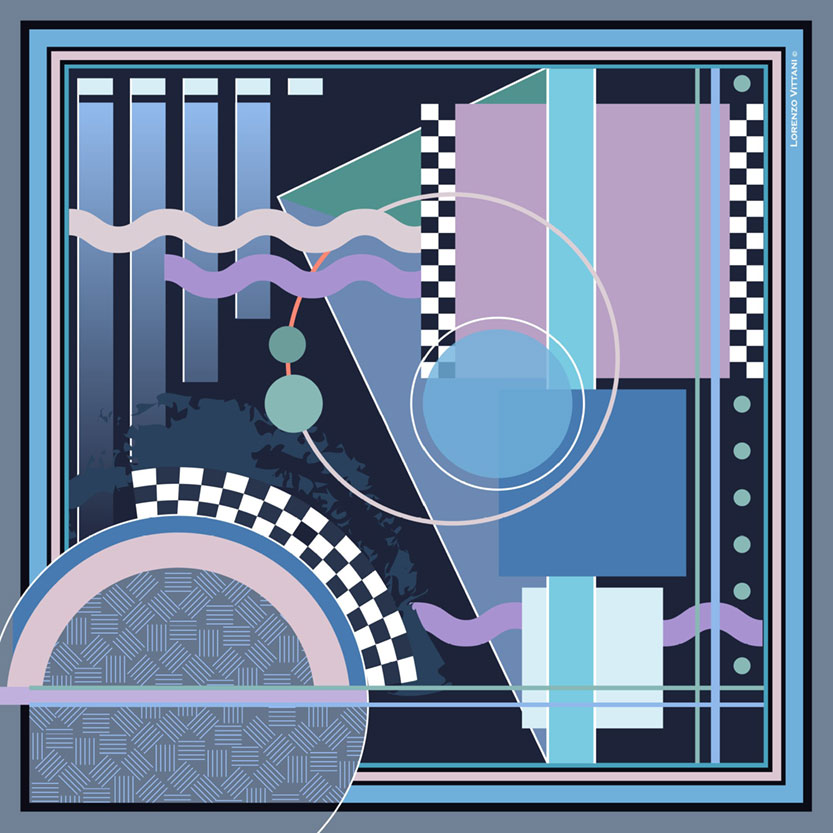 An interesting geometric design with a different vibe in each corner.  This colouway includes  a range of blues, purple, black and navy.