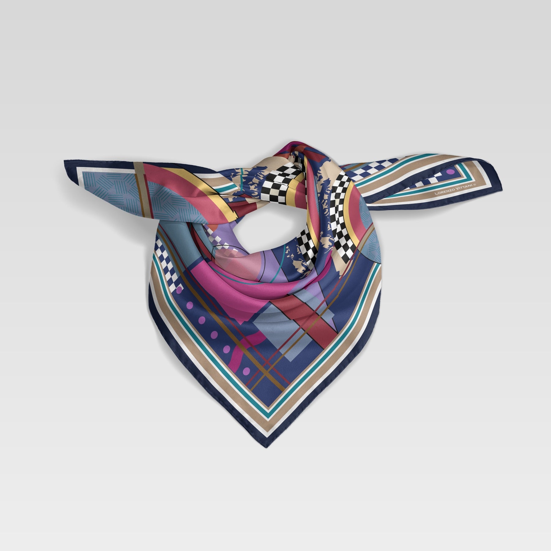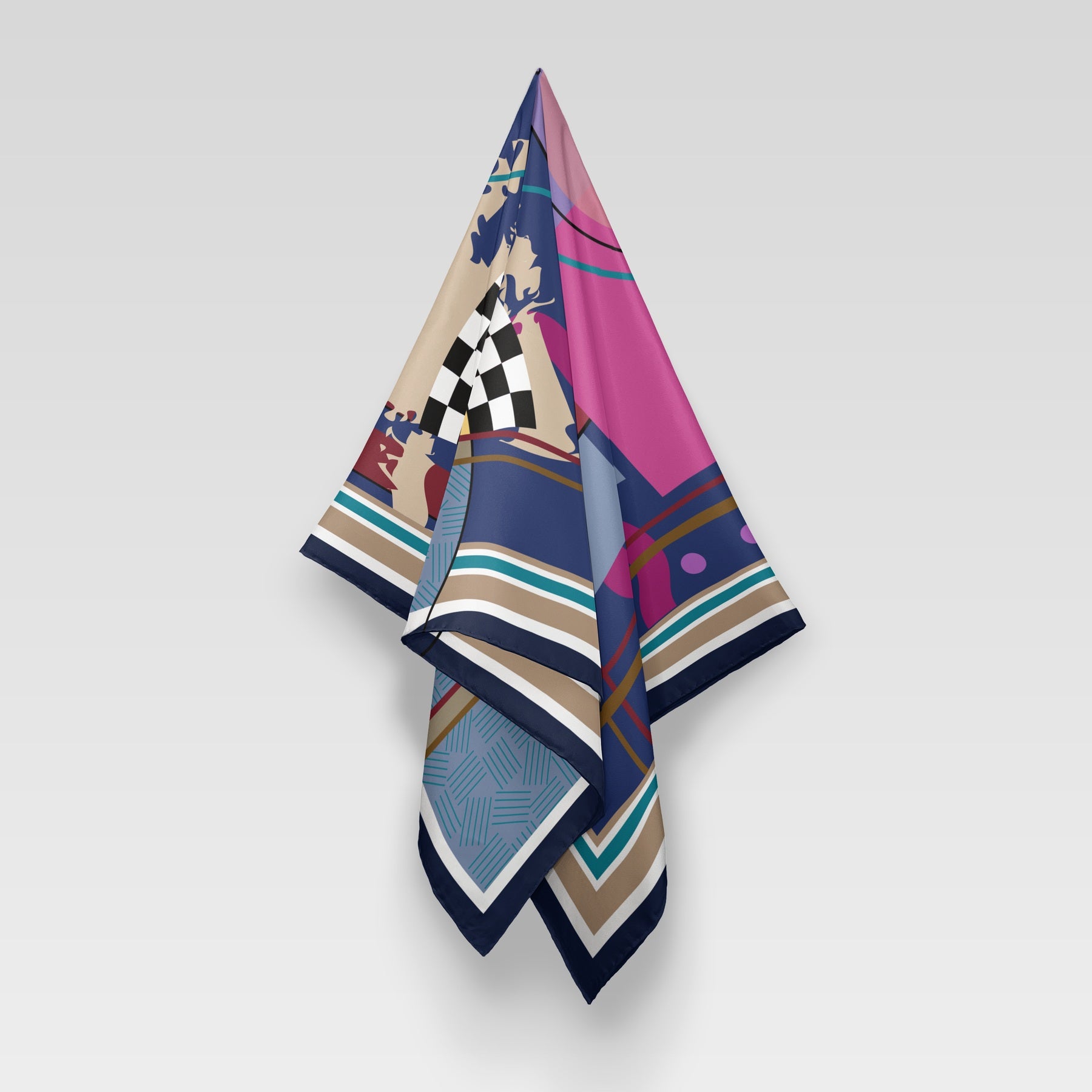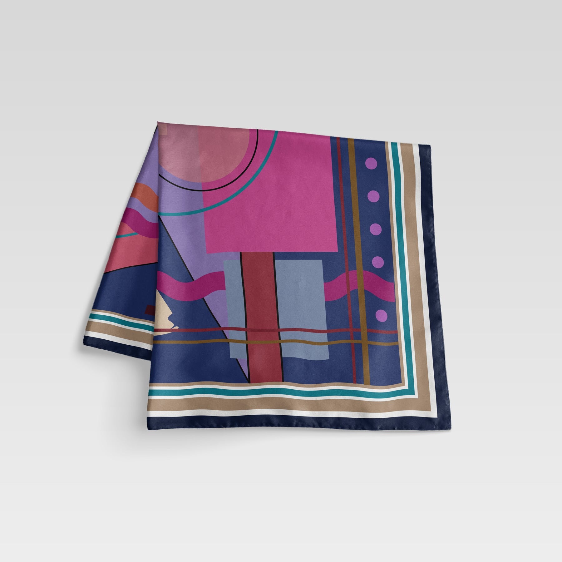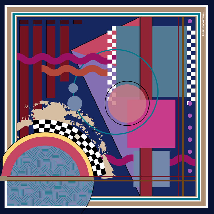 An interesting geometric design with a different vibe in each corner. This colouway includes teal, red, blues, mauve, black and white!