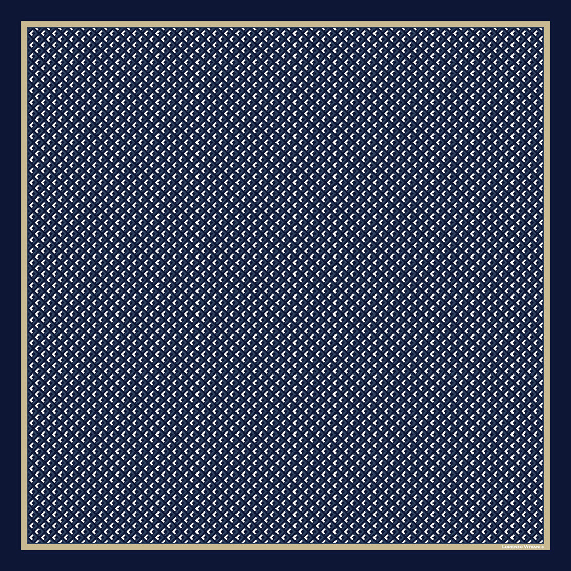 This scarf has a small all over pattern, featuring a navy, slate blue, and off white.
