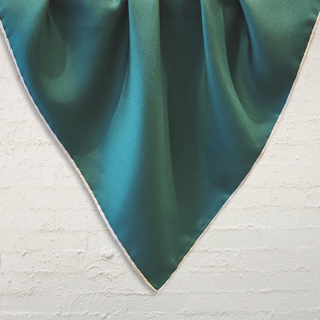 A plain emerald green coloured scarf with a 3mm hand hemmed contrasting almond border.